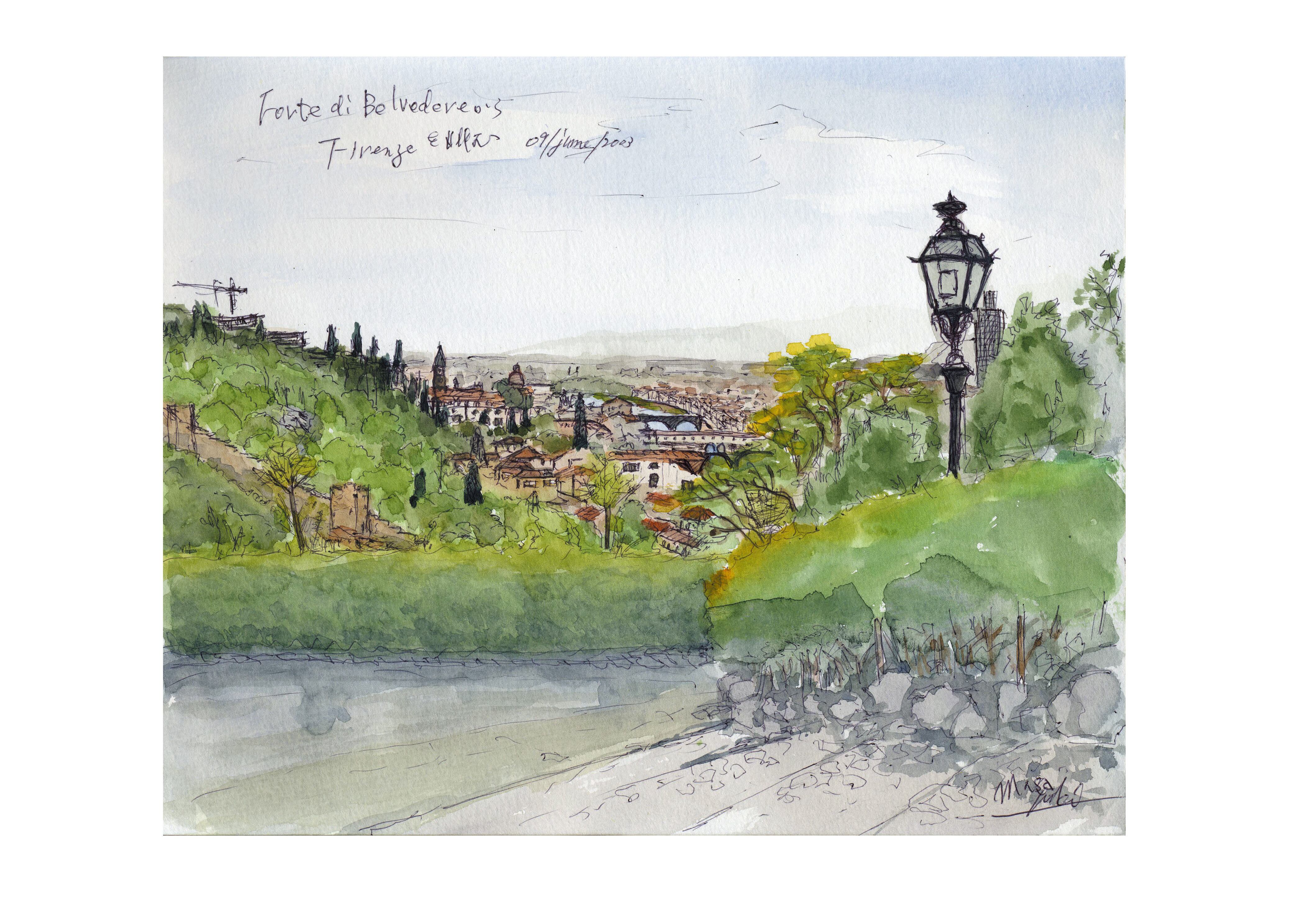 四枚目はフィレンツェのベルベデーレの丘から望むフィレンツェ市街とアルノ川。 宝石店が並ぶことで有名なベッキオ橋が見えます。